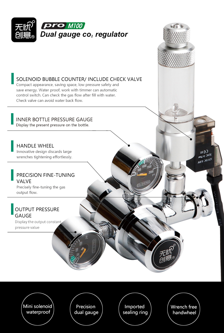 Co2 regulators are what control (or regulate) the flow of CO2 to your aquarium. I suggest using one with an electronic solenoid that can be set on a timer so you can control when it goes on and off automatically. Since plants only consume CO2 during photosynthesis (when light is available), it is a waste of gas to run Co2 when your lights are off.  Plus if you run your CO2 overnight, it can build up in the tank and kill your fish or at the very least cause unstable levels of CO2 as it accumulates at night and drains during the day. Most regulators these days have a needle valve built into them so you can control the flow (of how much gas is going into the tank). Lastly, they all have gauges that show you how much pressure is in your reserve tank, and the regulator from Uuidear can also show the amount of pressure in your Co2 system.